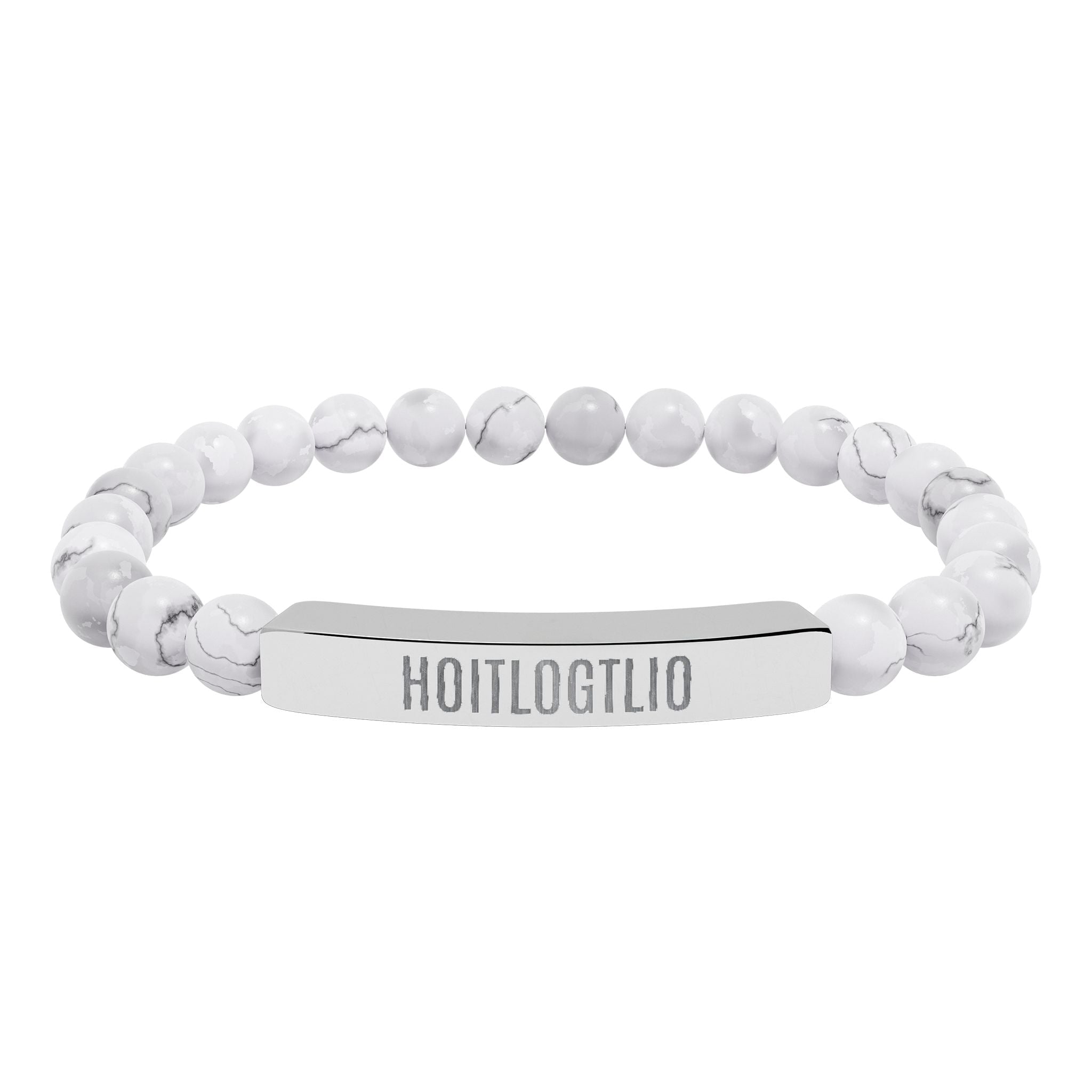 Clean, calm, and quietly confident, this white marbled howlite stretch bracelet brings a sense of clarity and stillness to everyday wear. Smooth stone beads rest on a flexible cord, punctuated by a brushed silver stainless steel engraved bar with this permanent declaration of faith. The cool silver finish complements the soft marbling of the stone without overpowering its natural beauty.