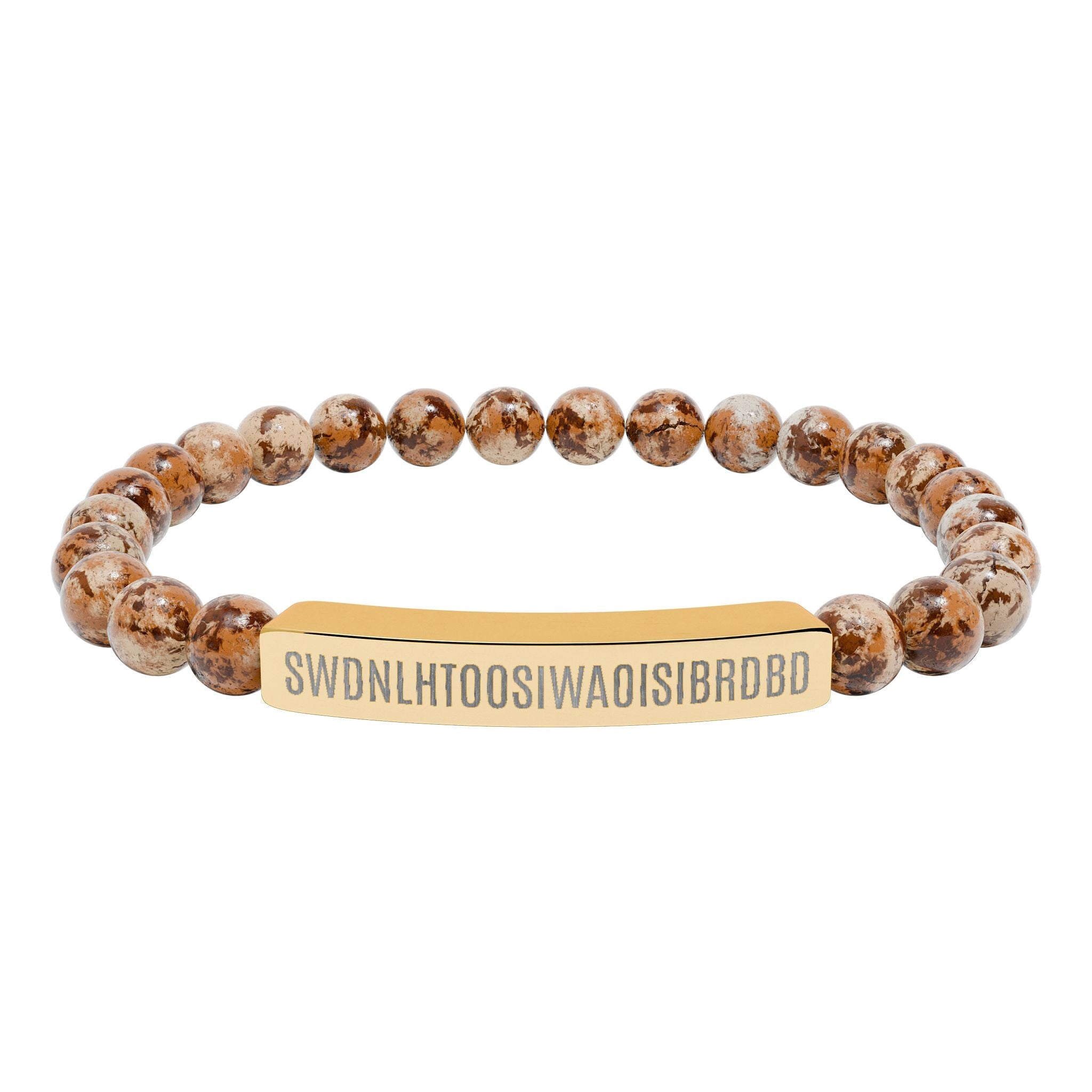 Earthy, grounding, and quietly resilient, this stretch bracelet features natural picture jasper stones—each bead carrying unique patterns that reflect the beauty found in imperfection. The stones rest on a flexible cord and are anchored by a brushed stainless steel bar finished in 18k gold, engraved with this permanent verse marker. The warm gold finish offers a gentle contrast to the stone’s organic texture, echoing the glory God places within ordinary, breakable vessels.