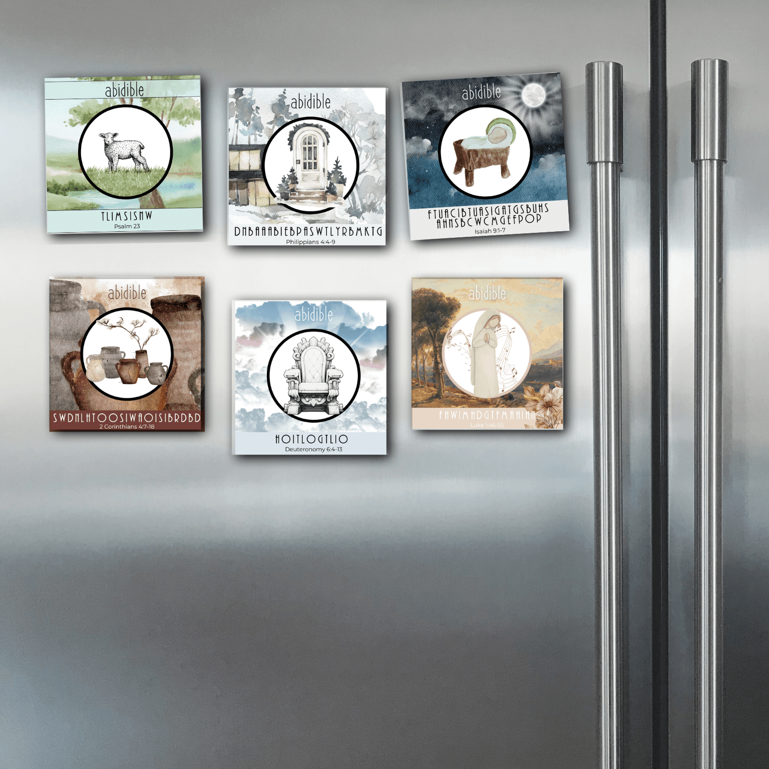 These six magnets are designed to echo the journey we’ve taken together on The Abidible Podcast—verse by verse, book by book, truth by truth. With Abidible’s signature artwork and lettering method, these magnets will help you carry Scripture into your ordinary rhythms. Keep them together on a board or scatter them around your home—each one will prompt remembrance, reflection, and worship.